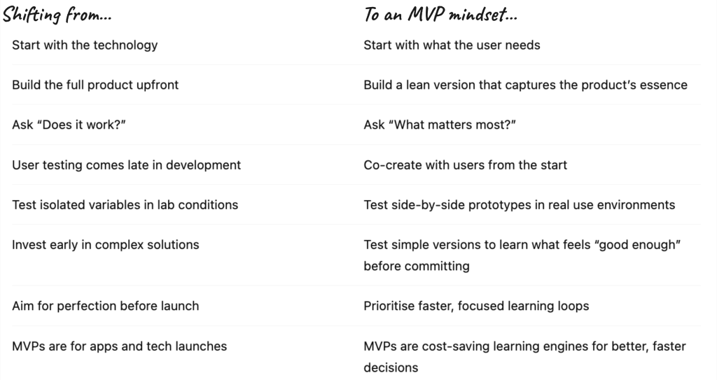 While many teams do test with users, MVP thinking shifts the timing, purpose, and focus of that testing. In traditional development, user testing often comes late, when the product is mostly complete. The aim is to validate performance and justify progression to the next project stage. This approach is testing to validate what had already been built, yet too late to guide what should be built. Even when testing happens earlier, it often focuses on technical performance only, covering a wide range of variables with no clear prioritisation, therefore increasing costs and time to launch. The user is a checkpoint, instead of a collaborator.